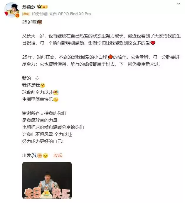 11日讯是孙颖莎岁生日,她更新社媒发文: